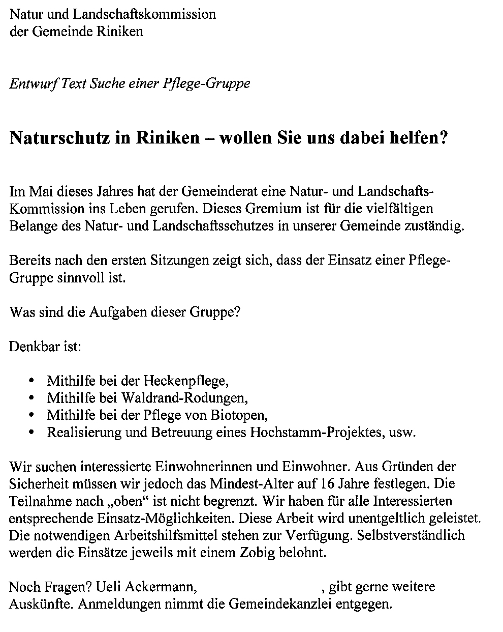 - erstellen eines kommunalen Naturschutz-Programmes (Mehrjahresprogramm für Umsetzung LEP und Nutzungsplanung)